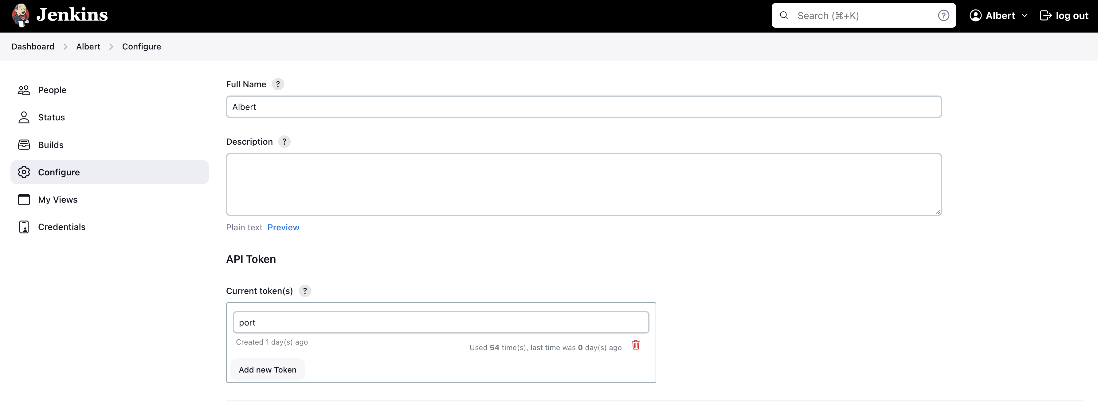 - In the Jenkins banner frame, click your user name to open the user menu.