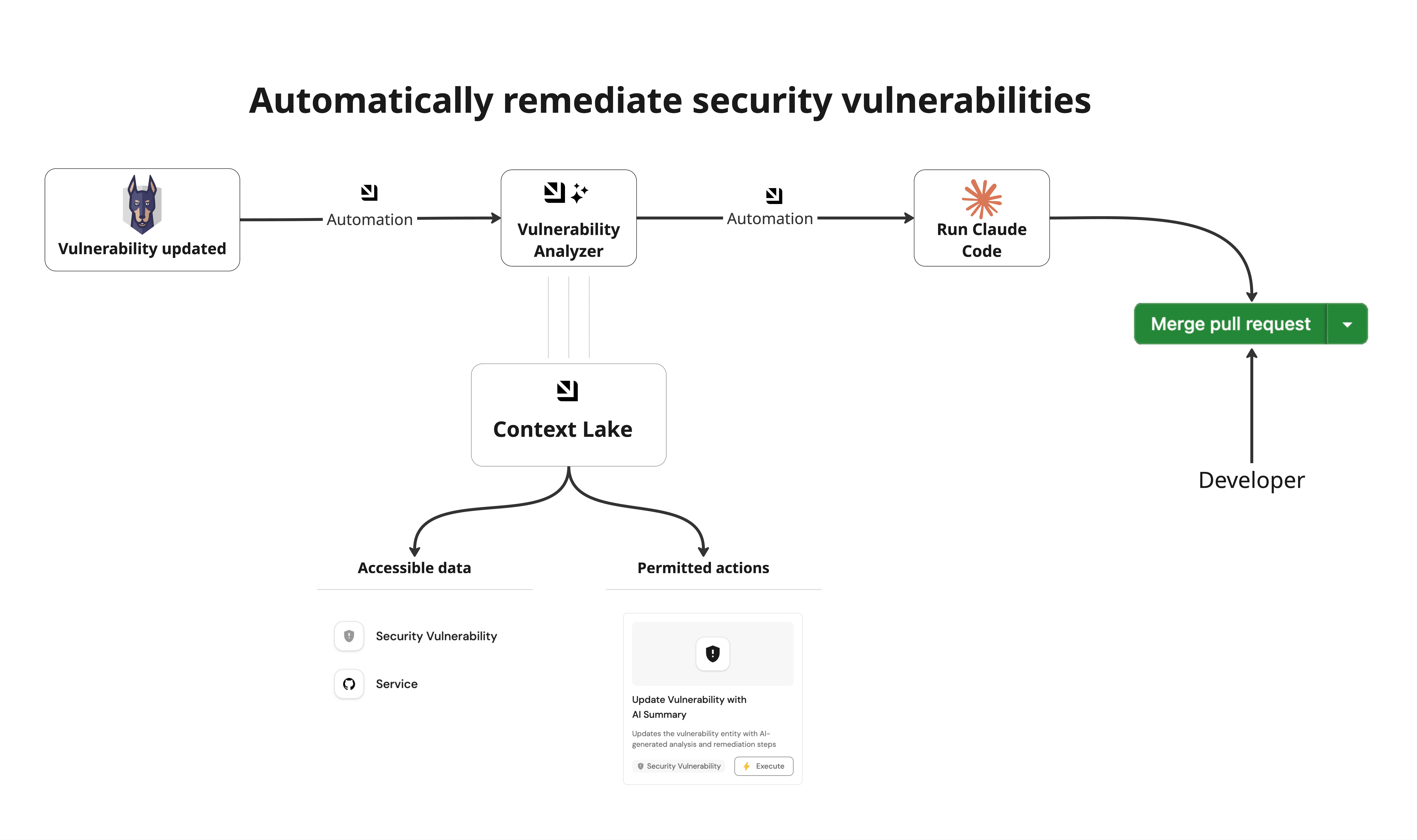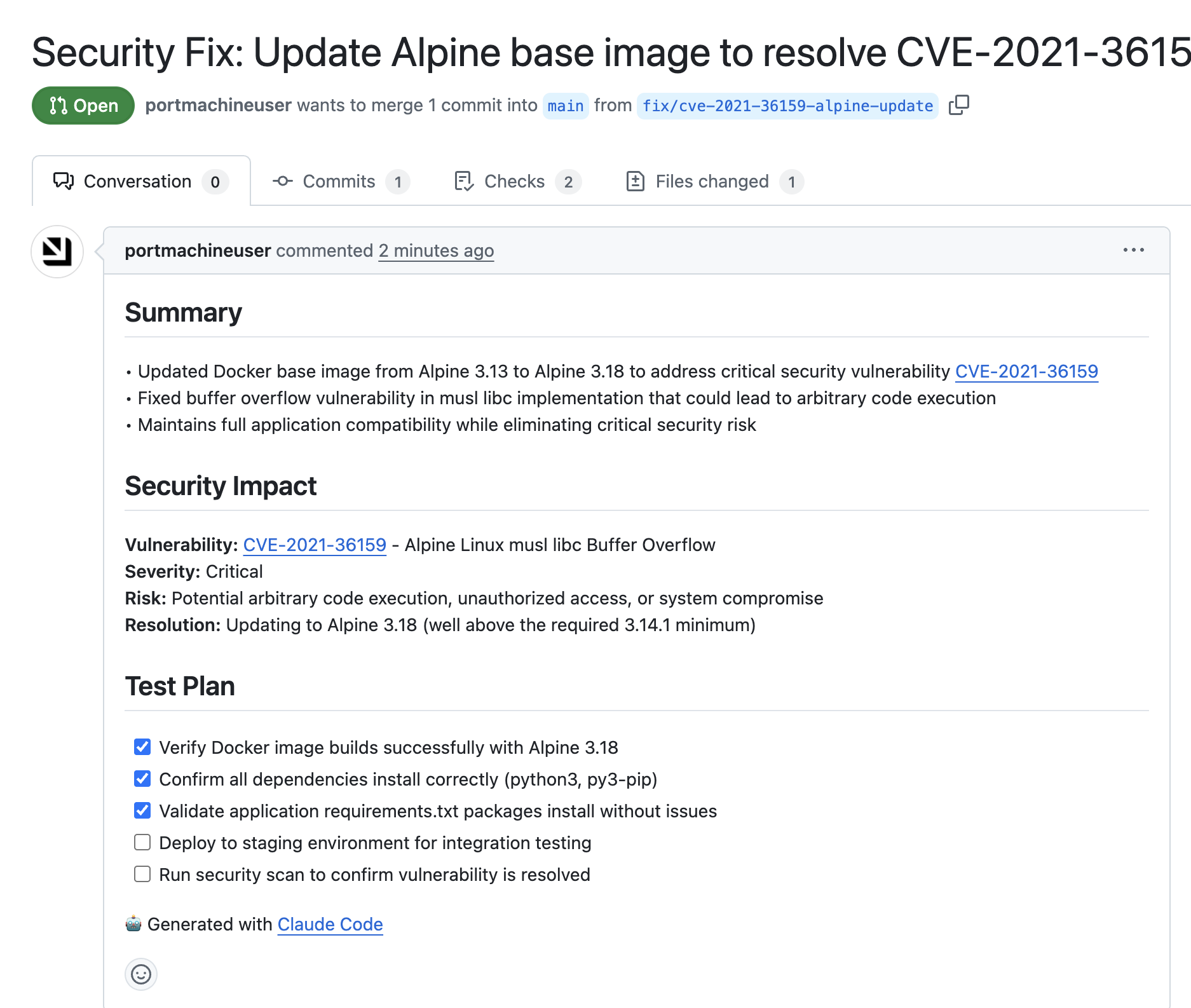 This guide demonstrates how to solve both problems using Port's AI agents. When a vulnerability is marked as critical, an AI agent automatically enriches it with a clear summary, impact explanation, and actionable remediation steps. Once that summary is available, Claude Code is triggered to generate and propose a fix in a pull request โ€” reducing time-to-remediation from days to minutes.