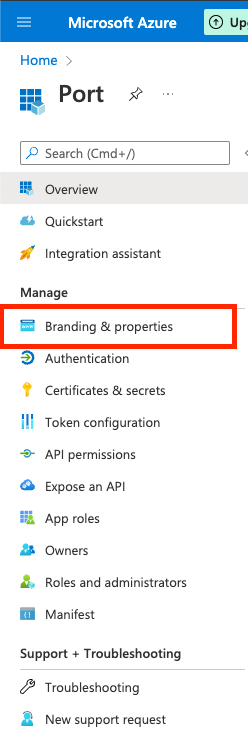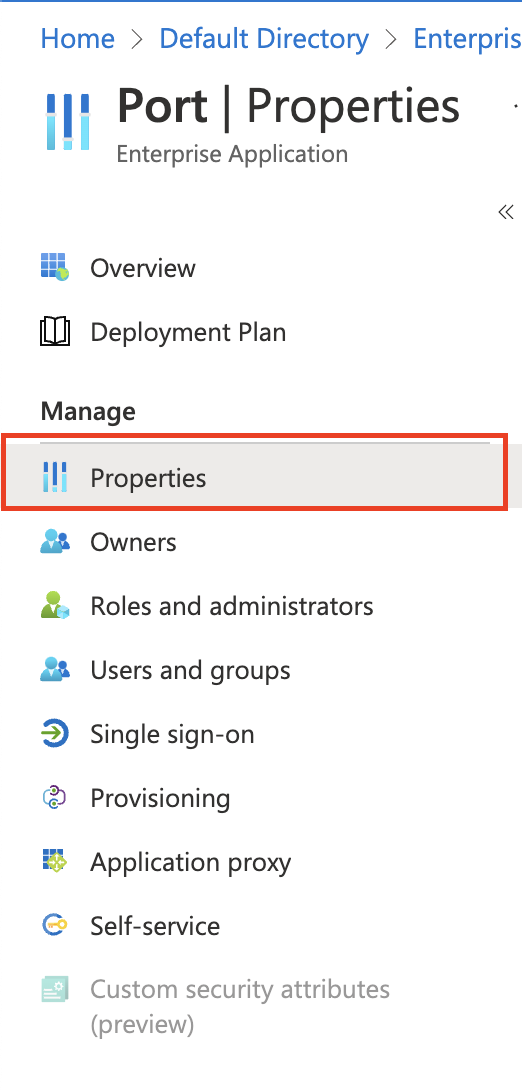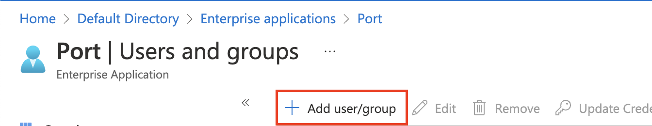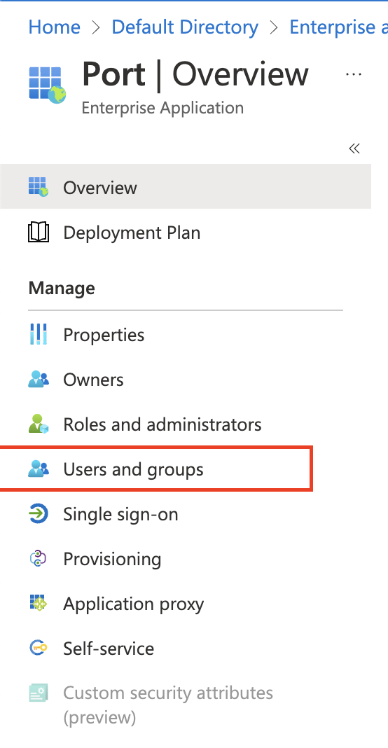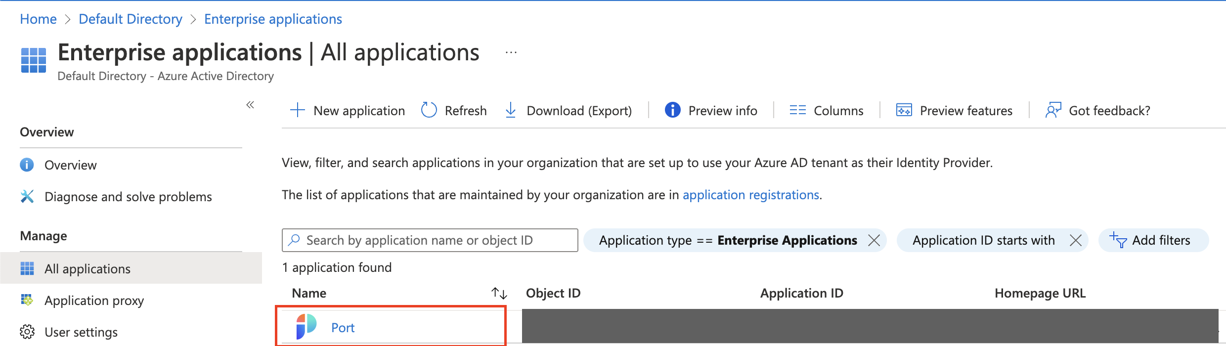 1. Go to Azure Active Directory > Enterprise Applications > Port app.